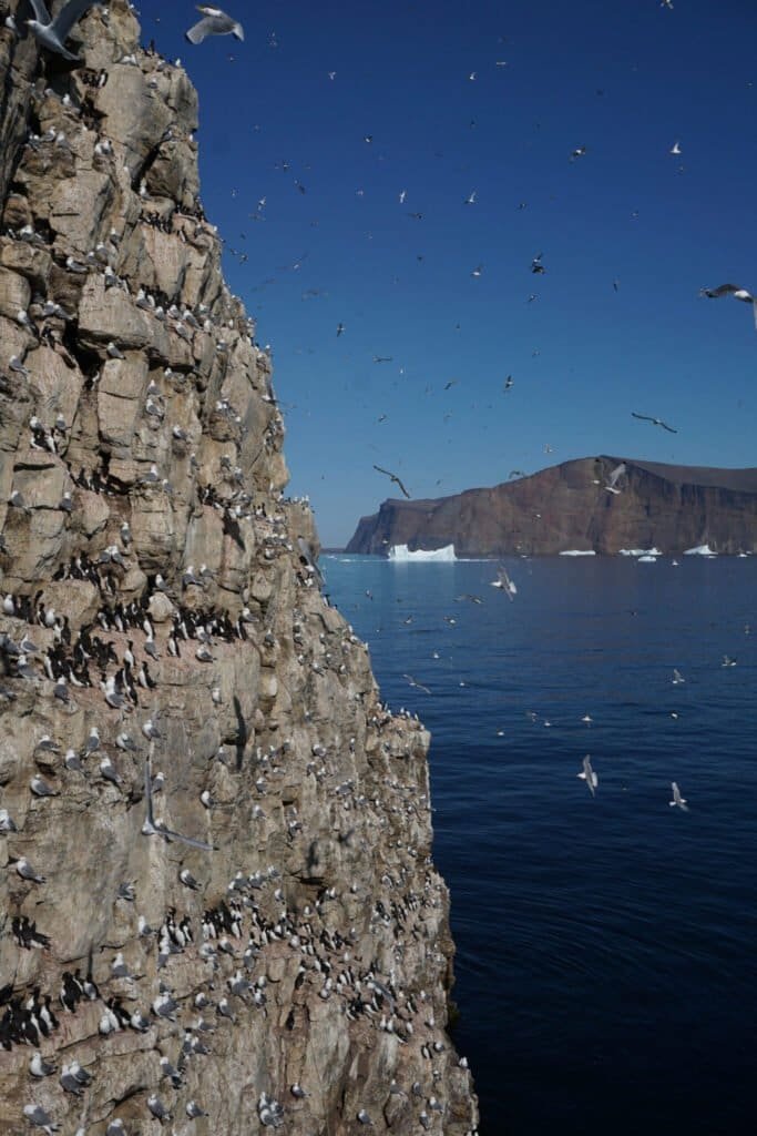 Large numbers of Brünnich’s guillemots (approx. 14,000 pairs) and black-legged kittiwakes (approx. 4200 pairs) breed on the steep cliffs, right up to the cliff edge.