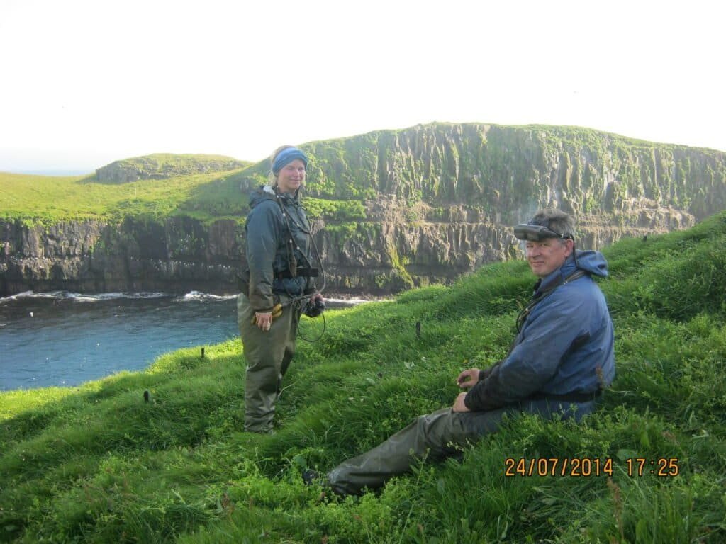 Researchers inspecting puffin burrows in Papey. Photo: Ingvar A. Sigurðsson.