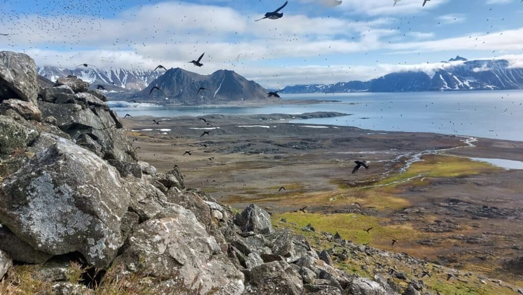Hornsund hosts a large population of the little auk (ca 500 000 breeding pairs). Brünnich’s guillemots and black-legged kittiwakes can also be found breeding in small colonies within the fjord. Research activity is mainly focused on the little auks, and has been since 1960 but the current monitoring of breeding biology and foraging ecology in the colony at Ariekammen slope, was established in 2001.