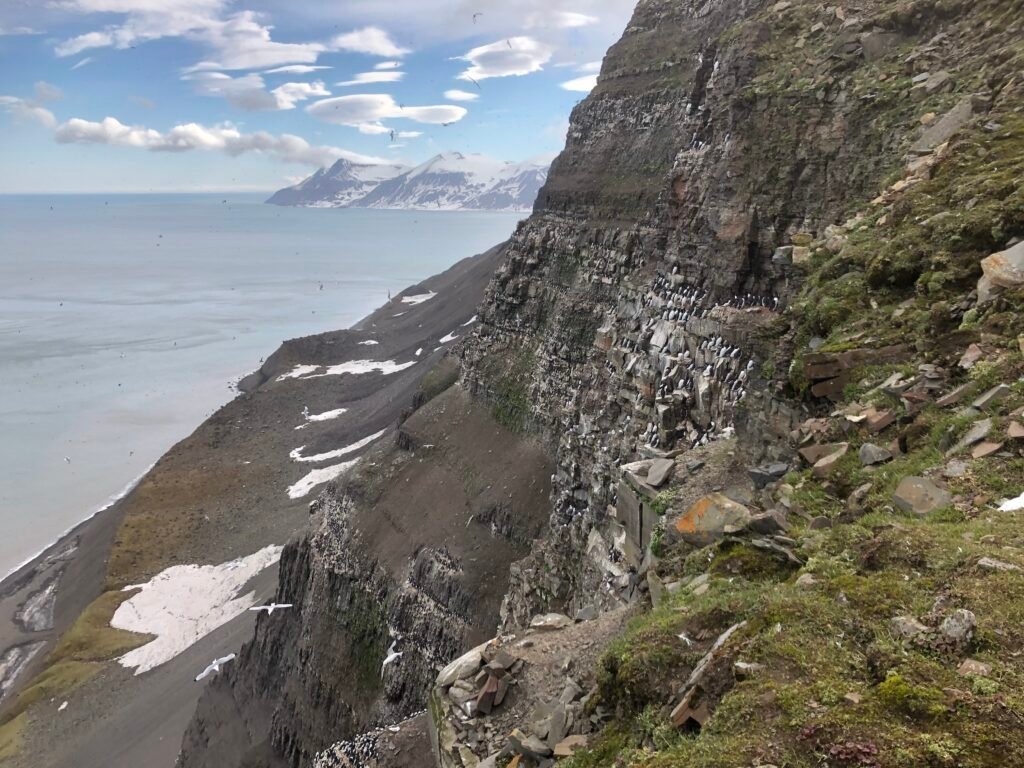 Most of the Brünnich’s guillemots on Svalbard breed in the South-East part of the archipelago but until now, very little data were available from this region. Koval’skifjella then became a SEATRACK location in 2021 with thirty GLS loggers being deployed on Brünnich’s guillemots. Koval’skifjella can only be accessed by helicopter (or after a few days of sailboat) and is not visited every year. After logger deployment in 2021, the colony was visited again in 2024 and some loggers were retrieved, provided the first tracking data from this part of Svalbard.
