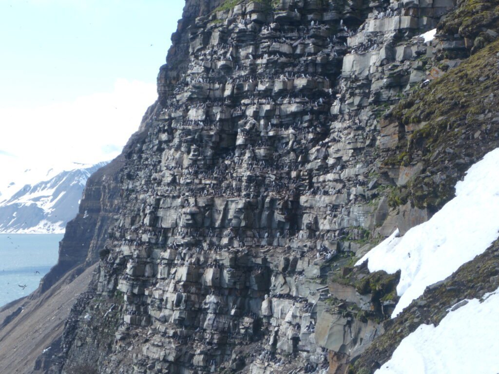 Koval’skifjella (79.065°N x 17.279°E) is a mountain located in South East Svalbard. Koval’skifjella is home to one of the largest seabird colonies on Svalbard with >40,000 individual Brünnich’s guillemots and approximately 5000 pairs of black-legged kittiwakes. Northern fulmars and glaucous gulls are also common breeders there.
