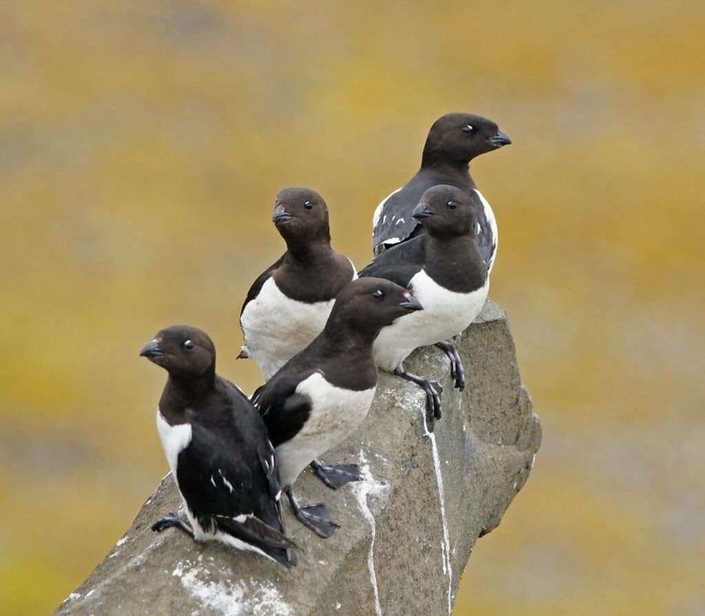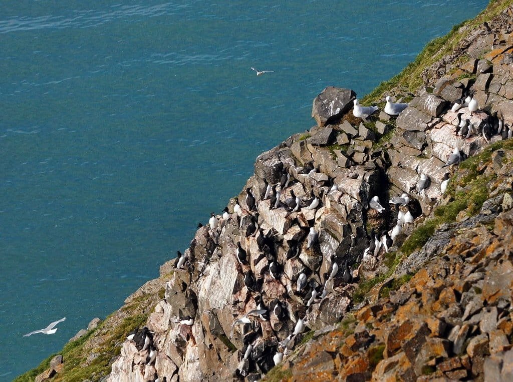 Tikhaya Bay and Rubini Rock located on Hooker Island (500 km2) in the very center of the archipelago, are amongst the best known seabird colonies in the Franz-Josef Land. Tikhaya Bay was first inhabited by humans during the wintering of Georgiy Sedov’s expedition in 1913/14, and later, with the establishment of a polar weather station in 1929, it became a central hub for scientific exploration of the archipelago. First population estimates of seabirds in Rubini Rock were carried out 1930. Since then, seabirds have intermittently been monitored on Rubini Rock, and studies of little auk ecology carried out in Tikhaya Bay. Rubini Rock supports large and diverse seabird colonies. It is estimated that some 15000 pairs of Brünnich’s guillemots, 1000 pairs of little auks, 10000 pairs of black-legged kittiwakes, 30 pairs of Glaucous gulls, some tens of pairs of black guillemots and less than 50 pairs of northern fulmars breed there. Larger separate colony of little auks stretches along the rocky slopes of Sedov Cape on the opposite coast of Tikhaya Bay.Tikhaya Bay was chosen as a pilot site for SEATRACK in 2013 and loggers deployed on Brünnich’s guillemots, black-legged kittiwakes and little auks but later deployments were limited only to little auks.
