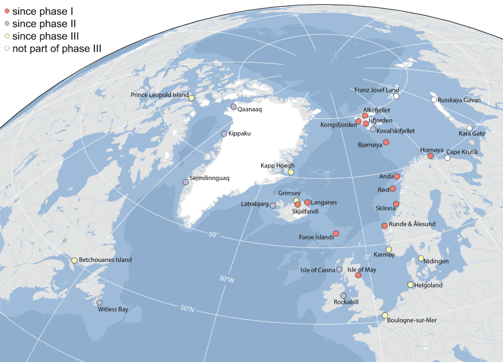 Black-legged kittiwakes (Rissa tridactyla), representing one of six pelagic surface feeding species within the scope of the project, are being instrumented with GLS loggers at 33 SEATRACK localities.